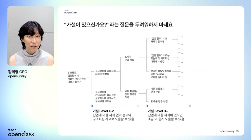 2025년 8월 오픈서베이가 진행한 <데이터 기반 비즈니스 문제해결 프로세스#1: 이슈 분석> 오픈클래스를 살펴보세요.