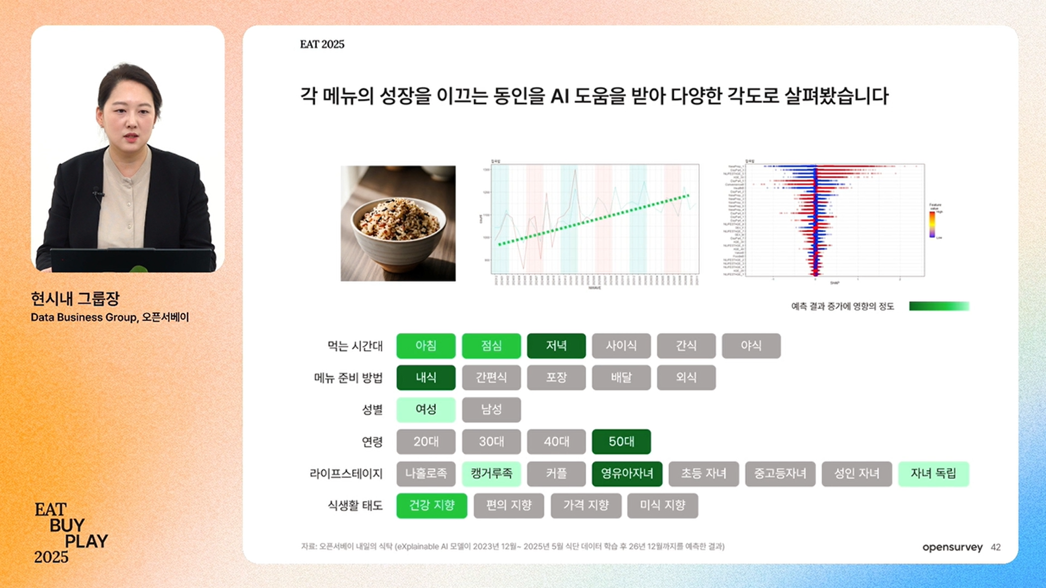 2025년 11월 오픈서베이가 진행한 <트렌드 웨비나-EAT 2025 | 대한민국 유일의 식단 데이터로 살펴보는 식생활 진화와 새로운 기회> 세션을 살펴보세요.